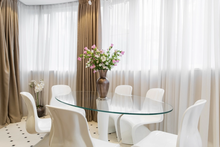 - На кухне сразу выделяется столешница и рабочая поверхность из натурального камня в тёмно-коричневого и чёрных цветах с белыми вкраплениями. Гармонично сочетаются бытовая техника, мойка, встроенная плита и вытяжка. Обратите внимание, кухня одновременно лаконична и роскошна. Дизайнерские стулья и обеденный стол занимают центральное положение в помещении и находятся перед легко окном, оформленным нежным тюлем.